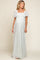 A chiffon maternity maxi dress featuring a ruffle accent squared neckline, short sheer sleeves, a back tie, and smocked top. Bust and body are fully lined.