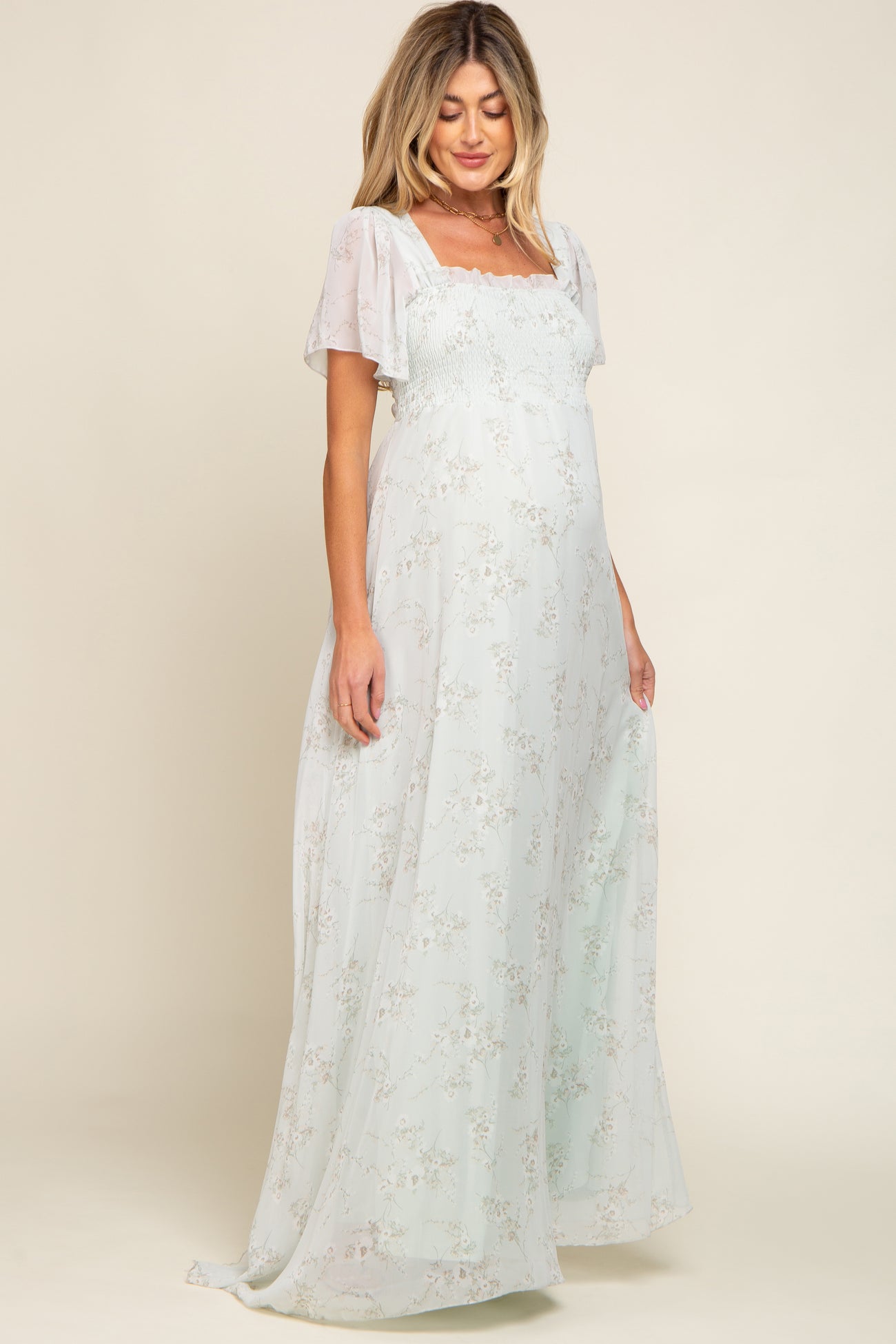 Mint Green Floral Smocked Chiffon Maternity Maxi Dress