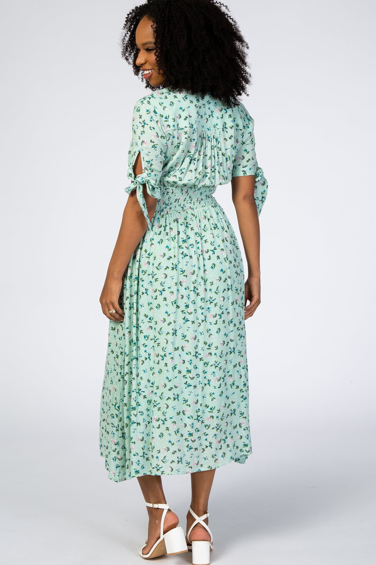 A floral print midi dress, featuring a V-Neck, button closures, a smocked waistline and tie sleeve details.