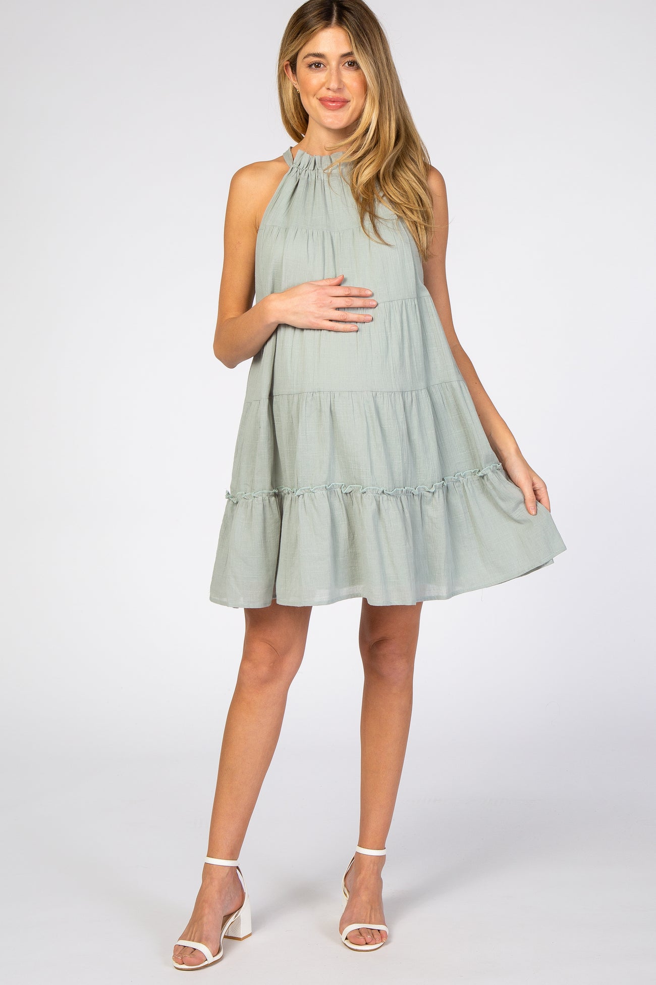 Mint Green Mock Neck Ruffle Tiered Linen Maternity Dress