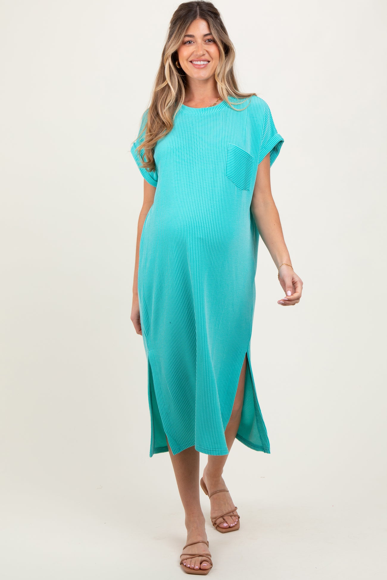 Mint Ribbed Short Sleeve Front Pocket Maternity Midi Dress