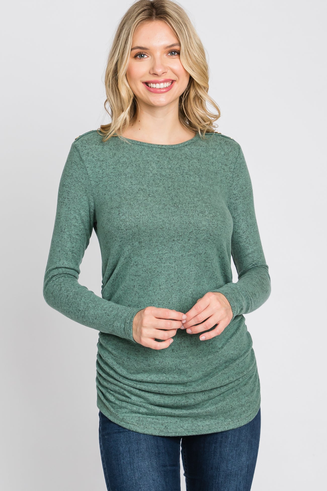 A soft knit, brushed top featuring a rounded neckline, long sleeves, button accents on the shoulder and side ruching.
