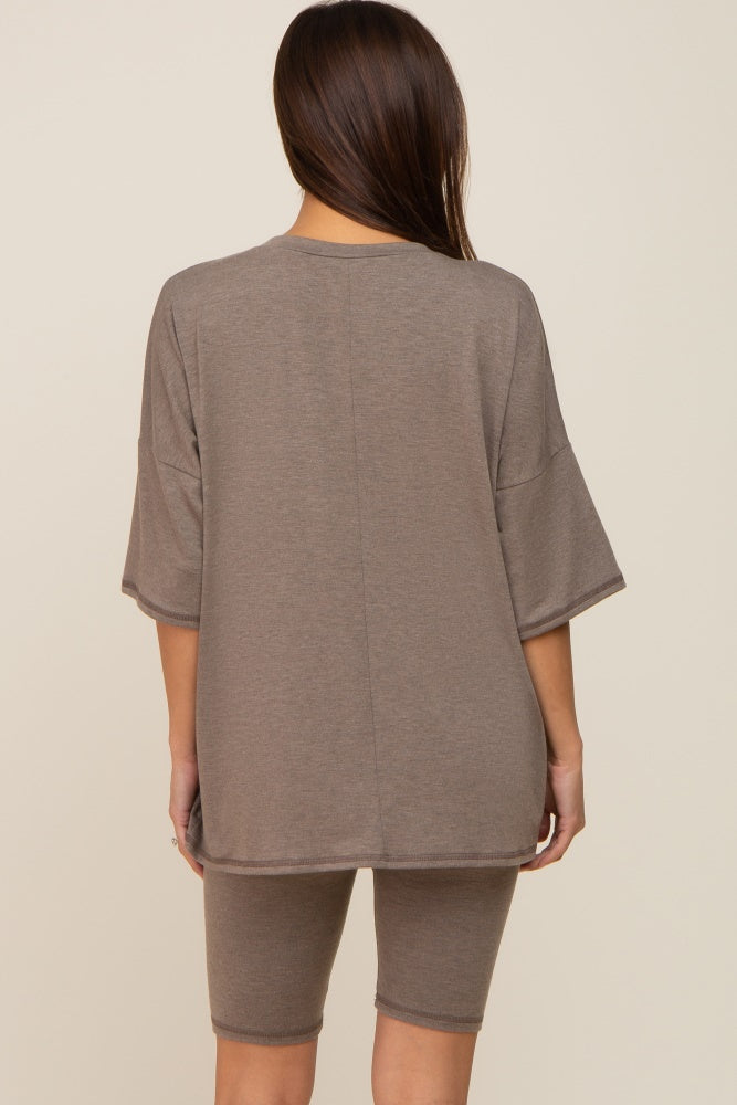 A sleep set featuring a dolman short sleeve top with a front pocket and a pair of biker shorts.