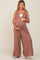 A soft knit maternity jumpsuit featuring a deep v-neckline and wide pant legs.