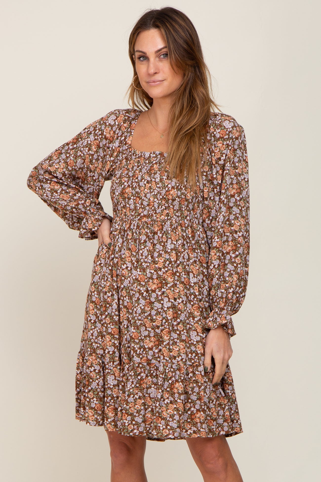 A floral maternity dress featuring a square neckline, a smocked elastic top, long puff sleeves, side pockets and a ruffle hem.