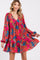 A floral and animal printed dress featuring a v-neckline, long puff sleeves, an empire waist, a ruffle hem and double lining.