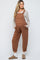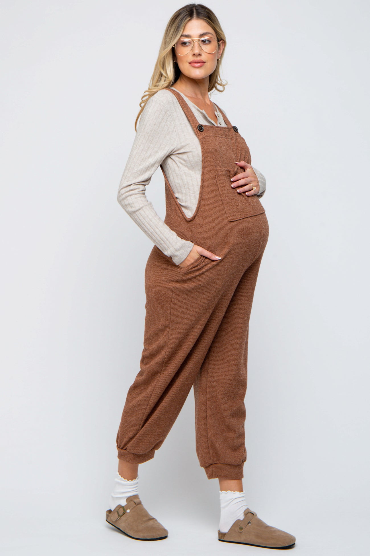 Details A knit maternity overall with adjustable button closure straps, a straight neckline, a front pocket, side pockets, and jogger pants, Content + Care