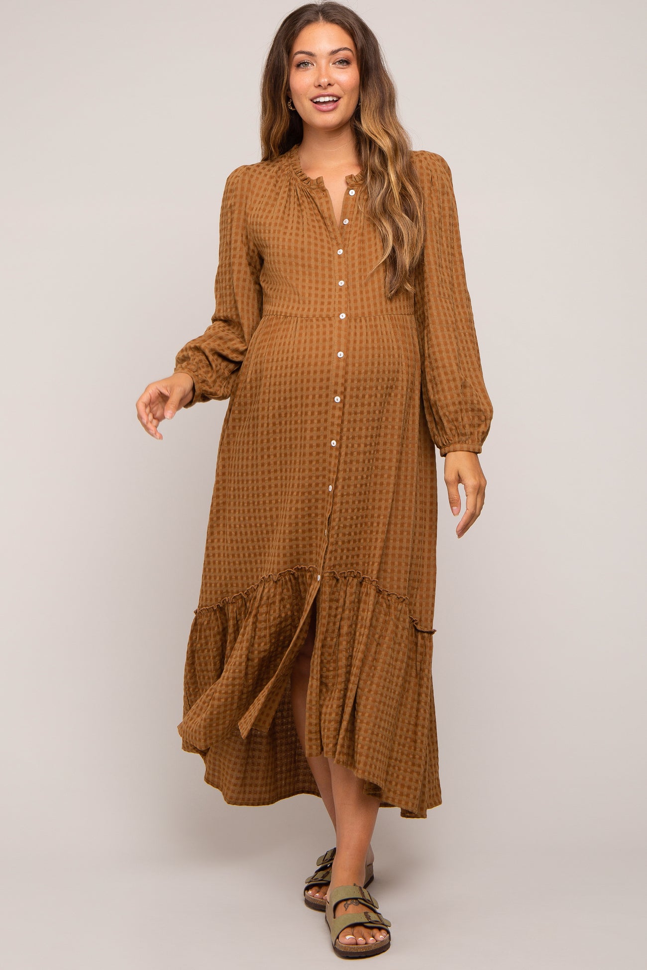 Details A printed lightweight maternity midi dress with button down closure and ruffle detail on neckline and hi-lo hem. Content + Care