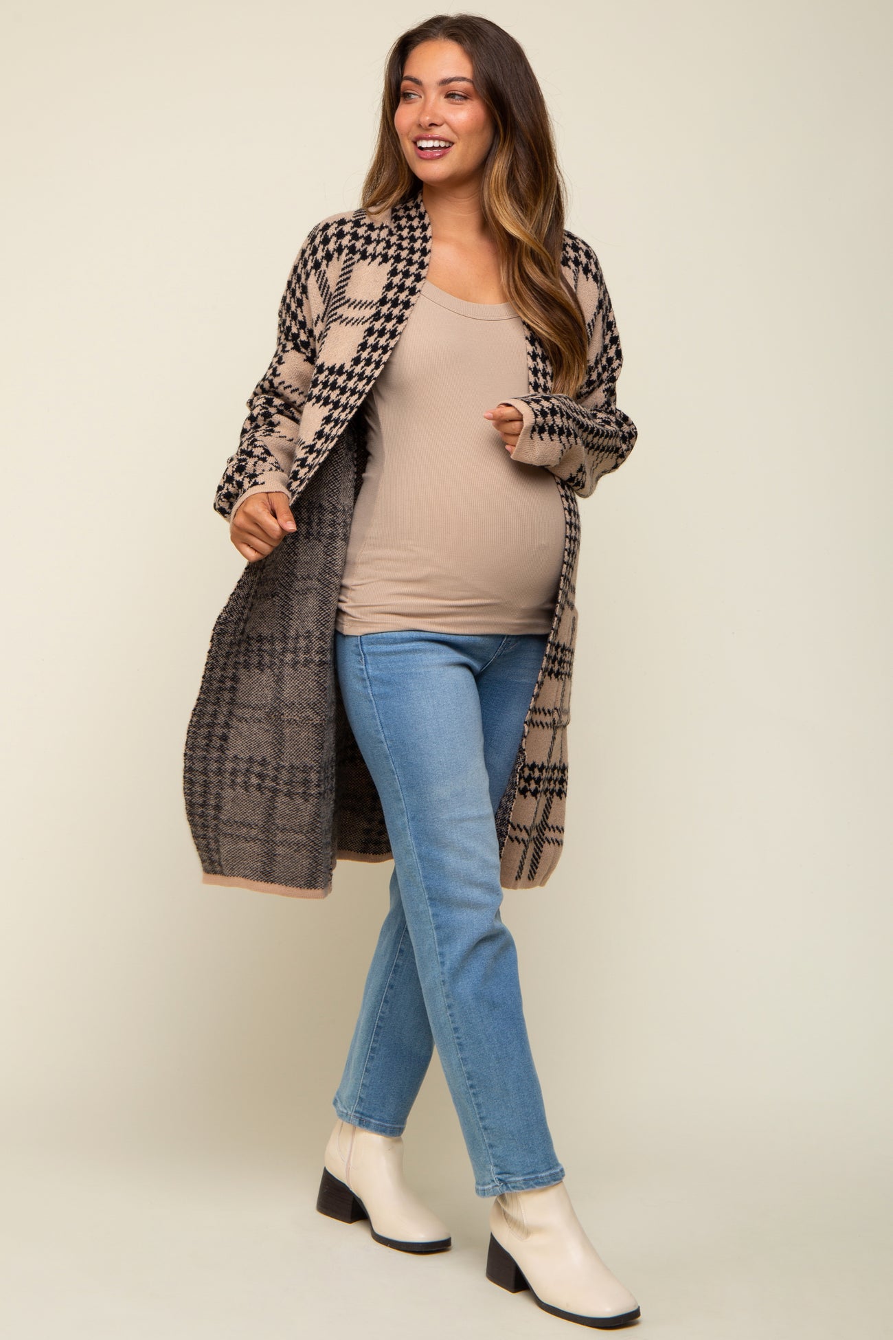 Mocha Houndstooth Long Maternity Cardigan