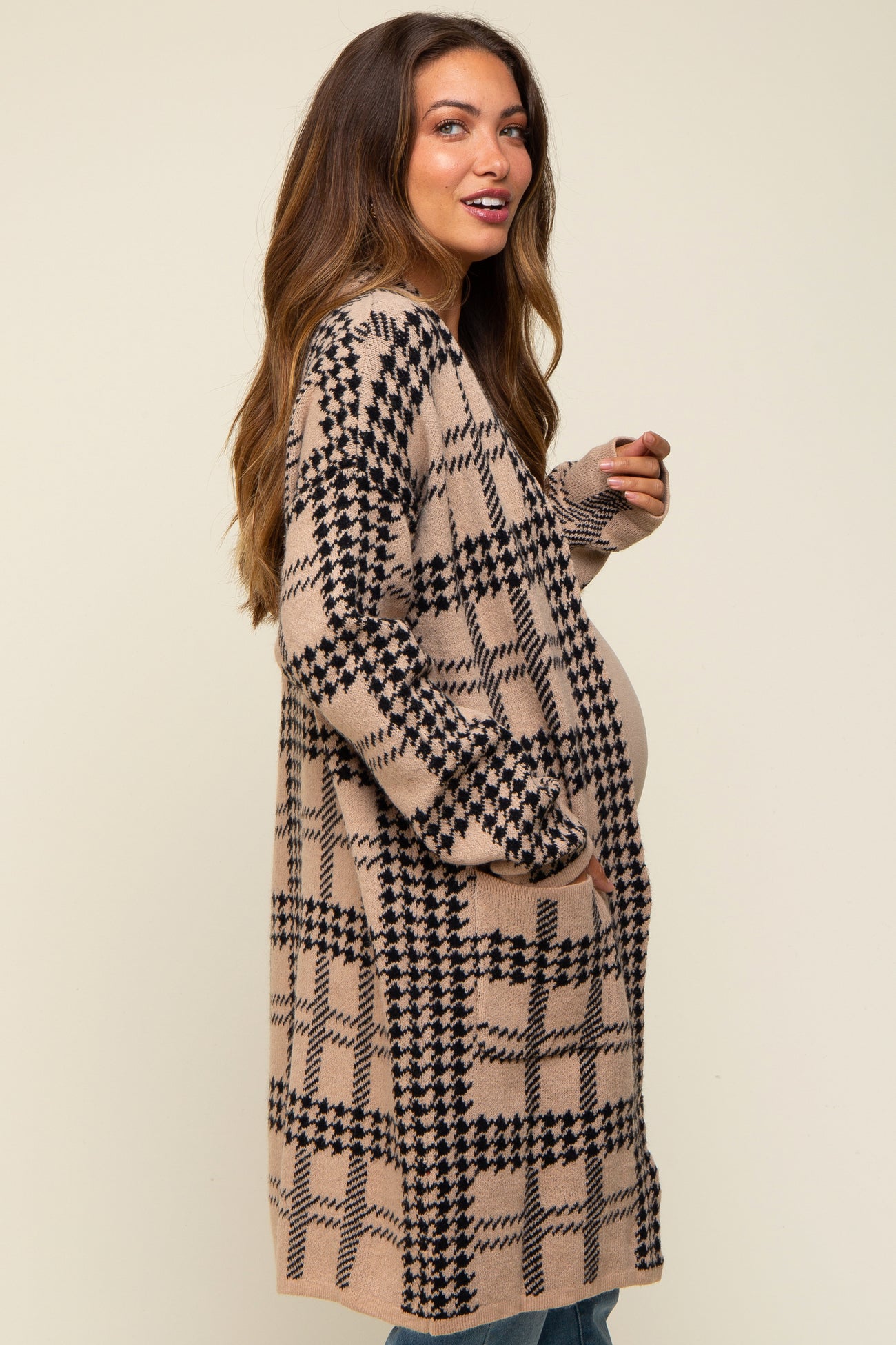 A houndstooth knit long maternity cardigan featuring an open front, two side pockets and long sleeves.
