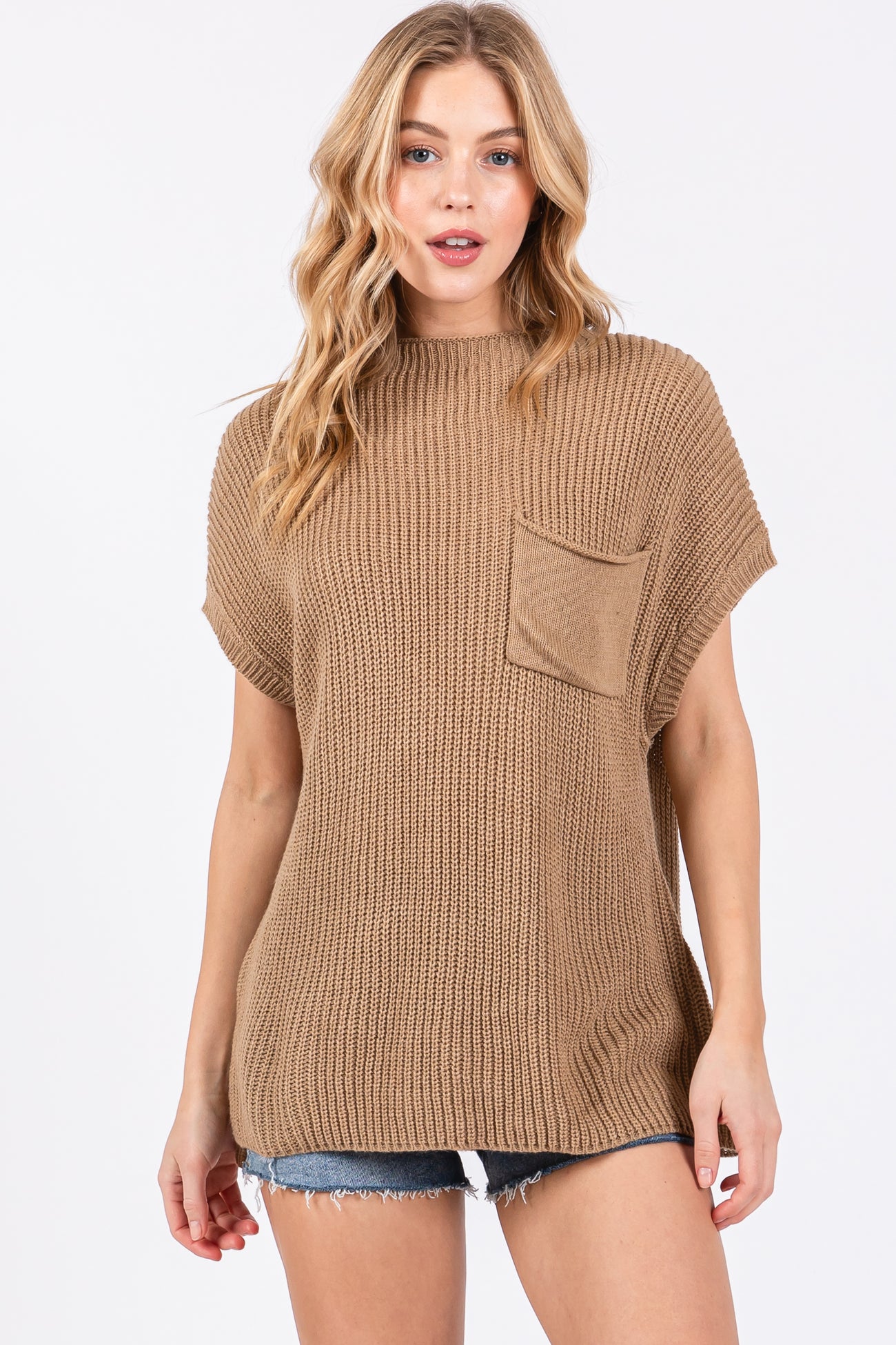 A solid knit maternity top featuring short sleeves, a front pocket and a rounded neckline.