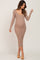 Details A solid ribbed knit maternity fitted midi dress with long sleeves and a wide v-neckline. Content + Care