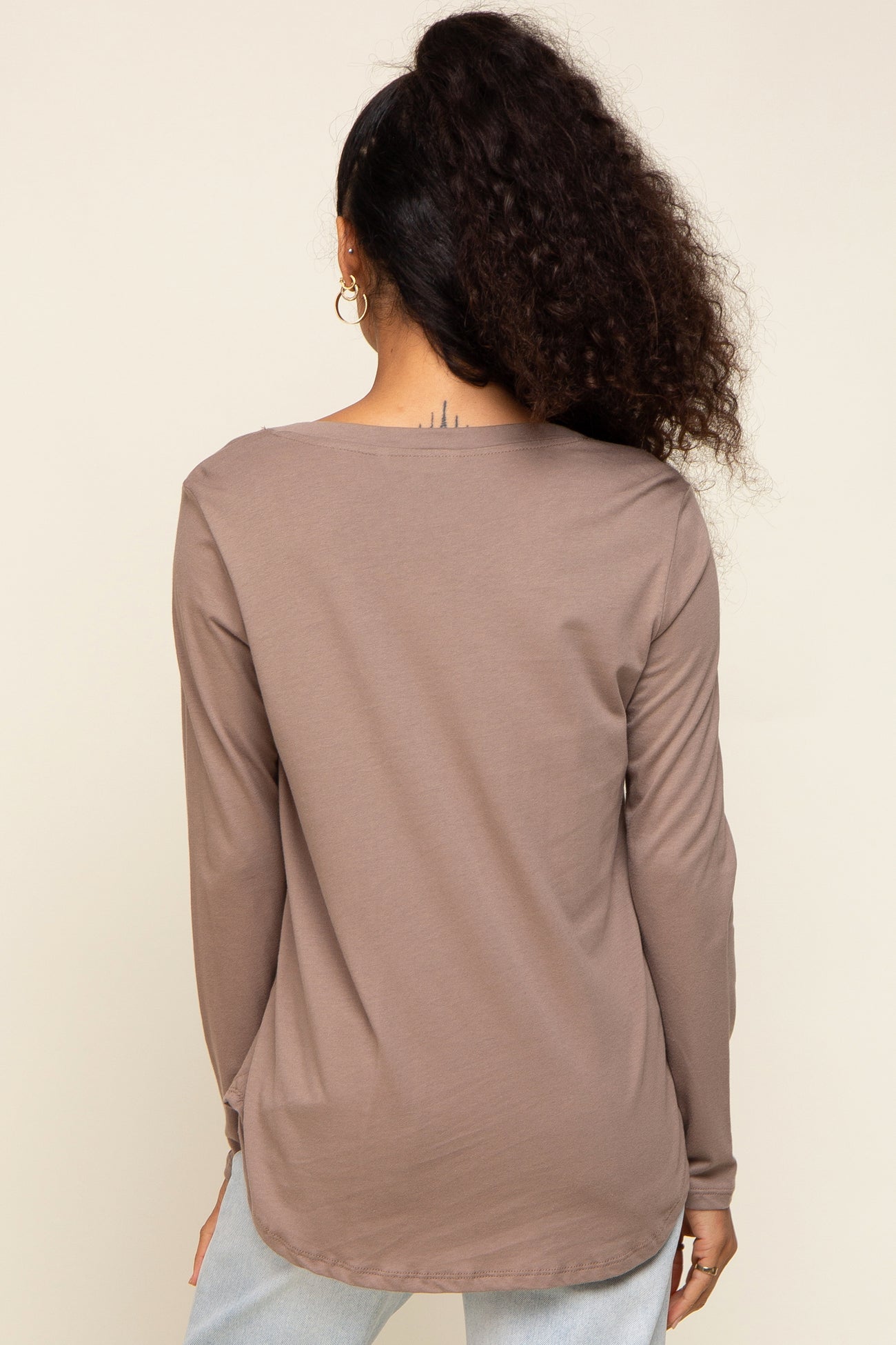 A solid top featuring long sleeves, a curved hem and a v-neckline.