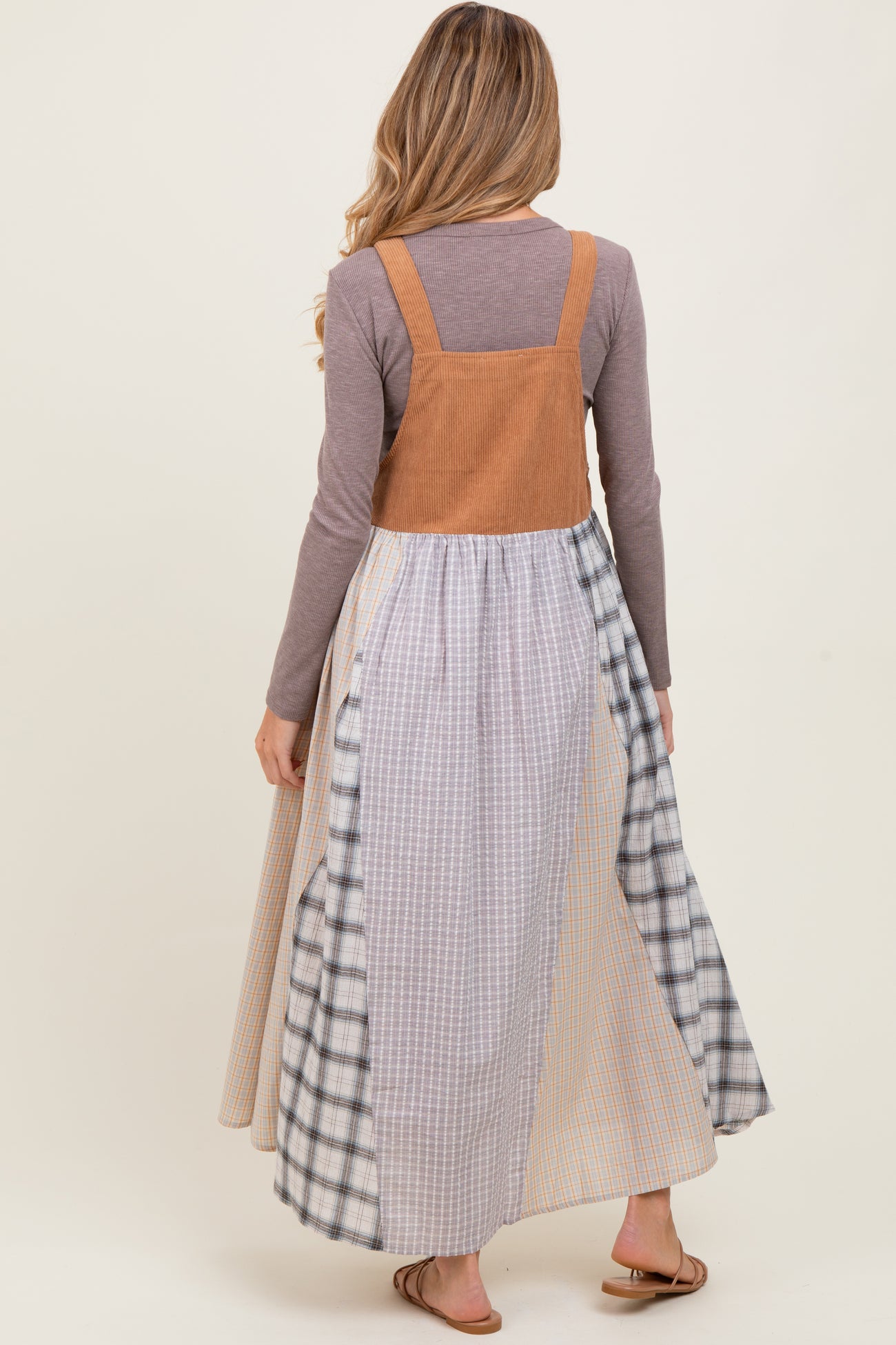 Mocha Multicolor Colorblock Plaid Denim Overall Maternity Dress