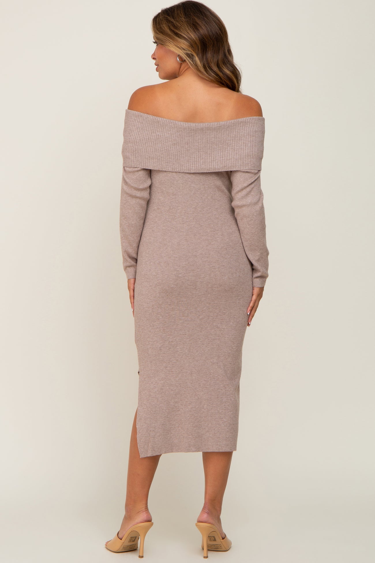 A solid off shoulder maternity sweater dress with a foldover neckline and one side slit.
