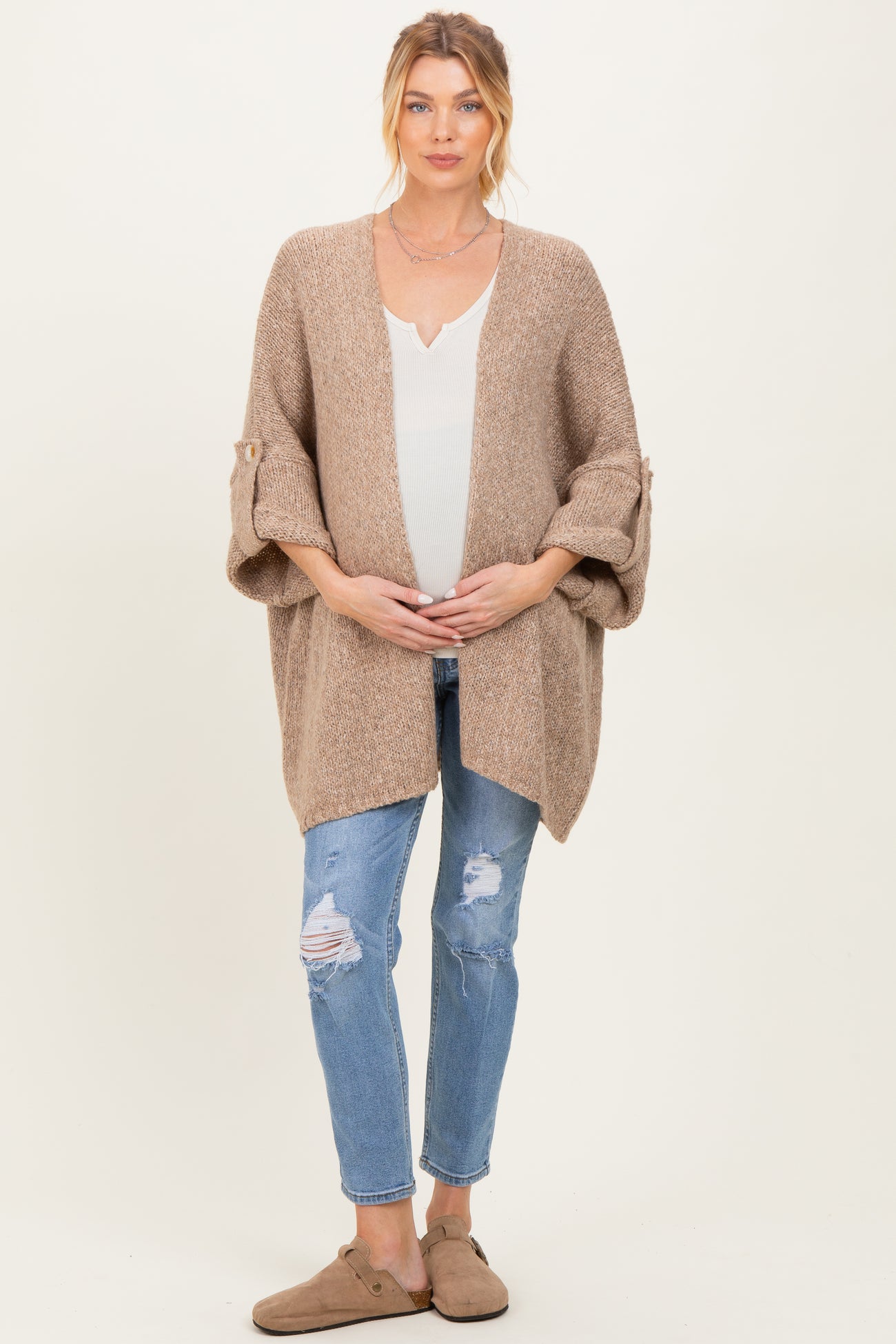 Stay cozy and stylish throughout your pregnancy with our Oversized Cuffed Sleeve Maternity Cardigan. Crafted from a soft, breathable knit, this cardigan offers a relaxed fit that effortlessly accommodates your growing bump. The open front design allows for easy layering over your favorite maternity tops, while the rolled cuff sleeves with button details add a trendy touch. Perfect for casual outings or lounging at home, this versatile cardigan is a must-have staple for any maternity wardrobe. Pair it with jeans or leggings for an effortlessly chic and comfortable look that moves with you. Machine washable for easy care.