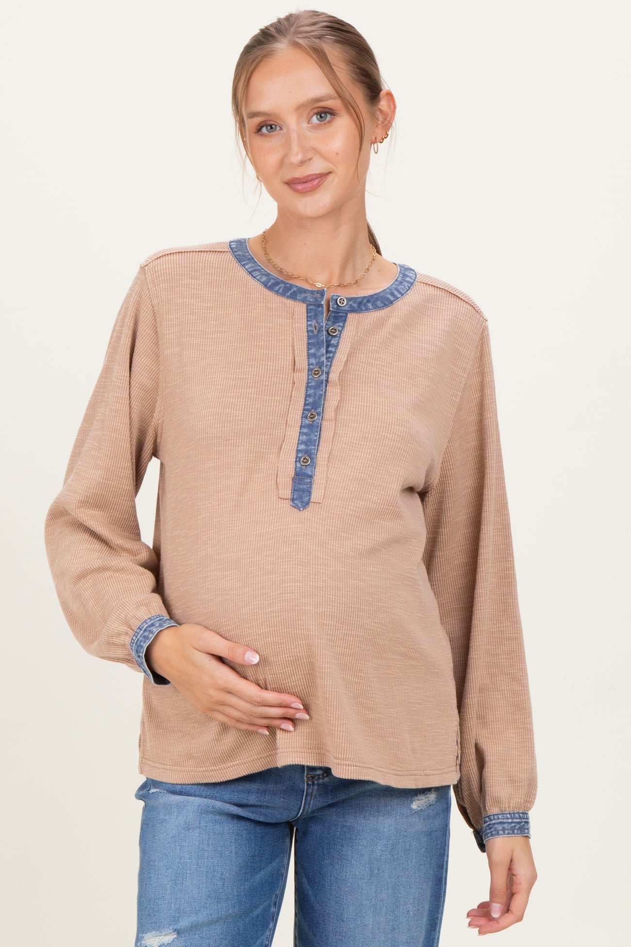 Elevate your casual maternity wardrobe with this rib knit Henley top designed for comfort and style throughout your pregnancy. Featuring a soft, breathable fabric with gentle stretch, it accommodates your growing bump without sacrificing shape or support. The detailed button placket and contrasting trim at the neckline and cuffs add a chic touch, making it perfect for everyday wear or relaxed weekends. Long sleeves provide cozy coverage, while the easy-fit silhouette ensures all-day comfort. Pair it effortlessly with jeans or leggings for a versatile, laid-back look that moves with you from trimester to trimester.