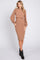 A rib knit midi dress featuring a mock neck, long puff sleeves, and a top layer that allows for nursing access.