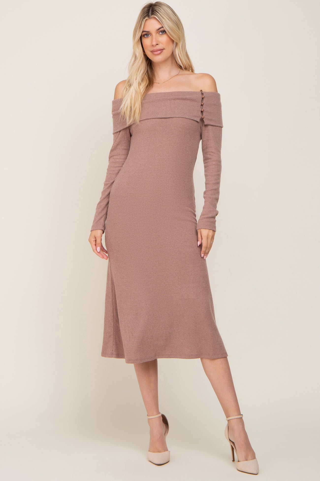 Mocha Ribbed Knit Foldover Off Shoulder Maternity Midi Dress