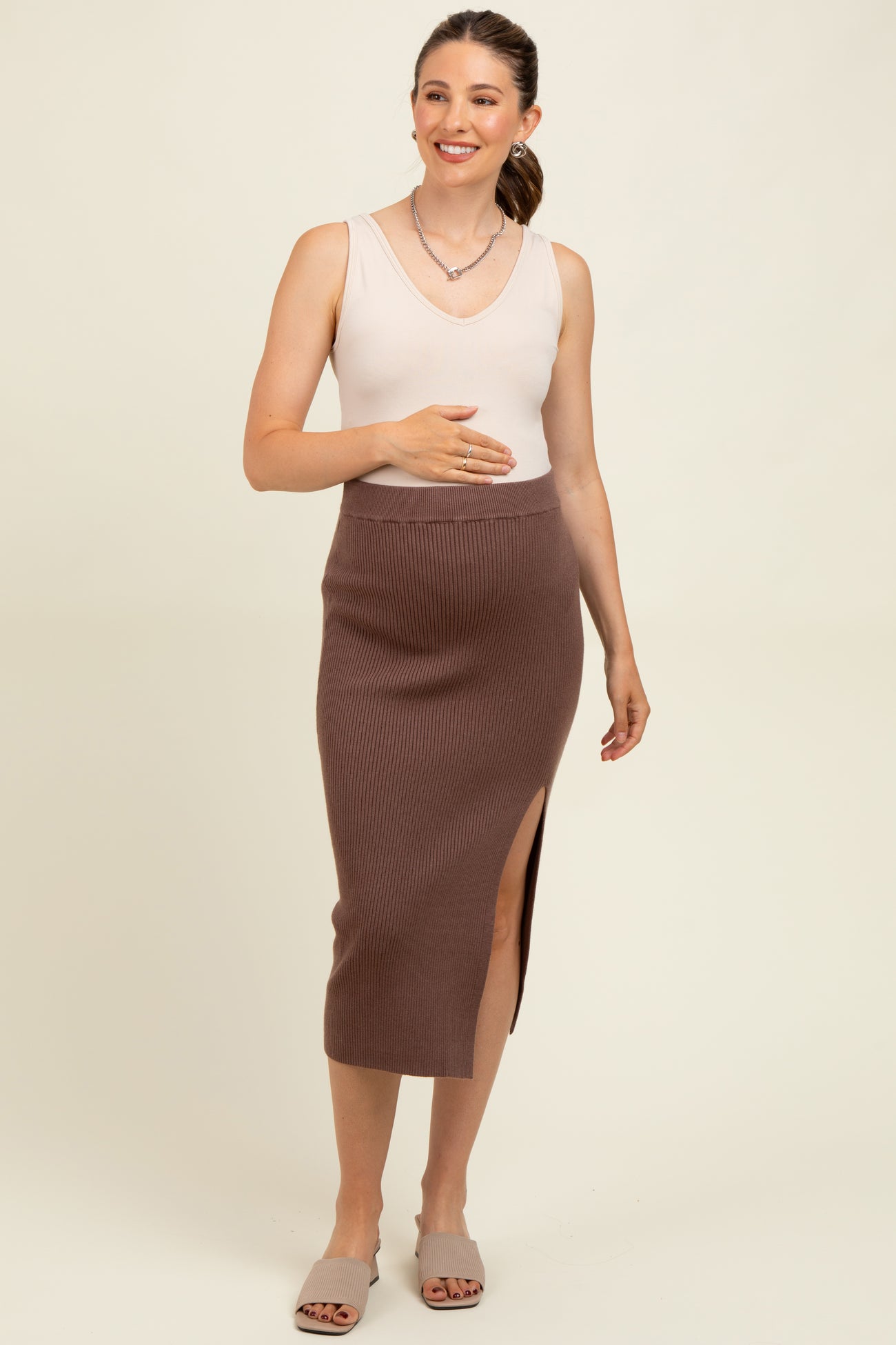 Mocha Ribbed Knit Side Slit Maternity Midi Skirt