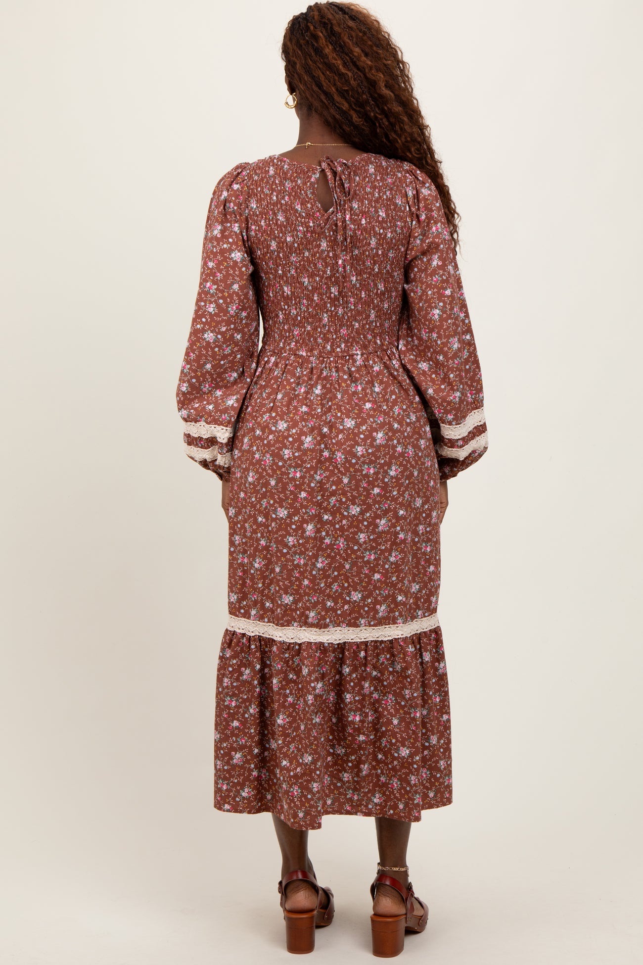 Mocha Smocked Floral Crochet Lace Trim Maxi Dress