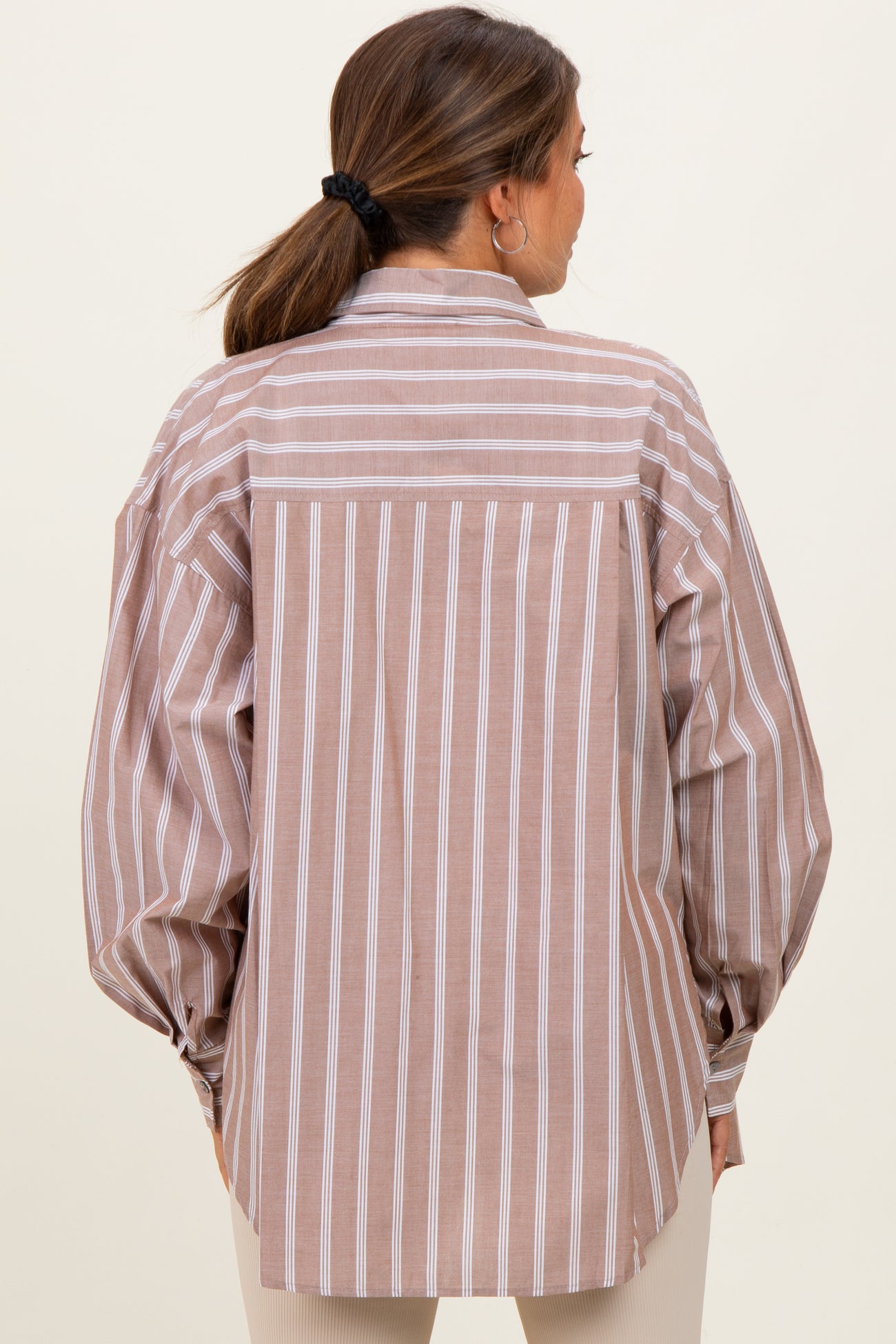 Elevate your maternity wardrobe with our Mocha Striped Button Down Maternity Shirt. Designed for comfort and style, this shirt features a relaxed fit with vertical white stripes on a warm mocha background, perfect for flattering your growing bump. The button-down front allows easy layering, while the soft, breathable fabric ensures all-day comfort. Long sleeves with button cuffs add a classic touch, making it ideal for both casual and professional settings. Pair it with your favorite maternity pants or leggings for a chic, versatile look throughout your pregnancy and beyond. Embrace effortless maternity style today!