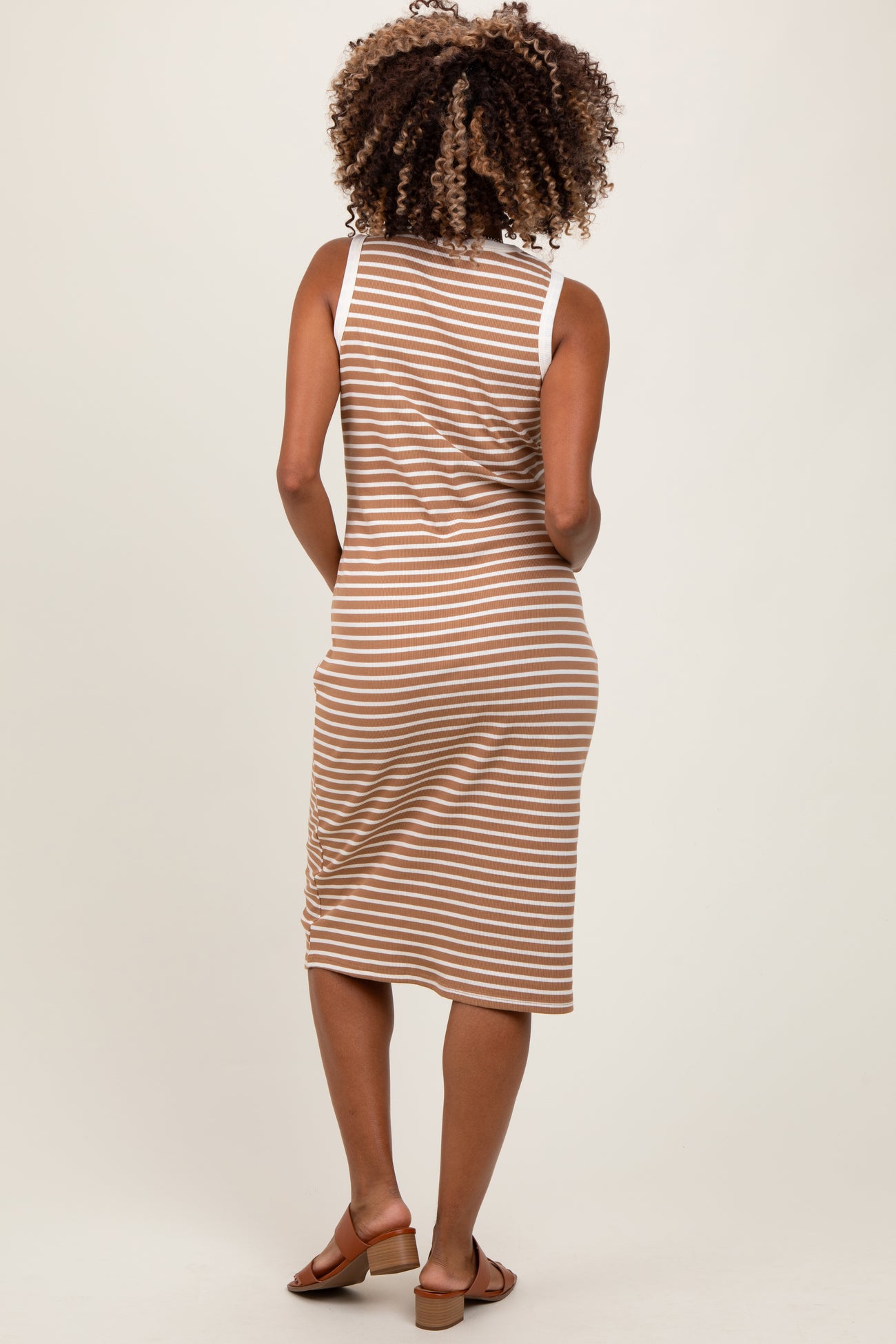 Mocha Striped Ribbed Knit Sleeveless Maternity Midi Dress