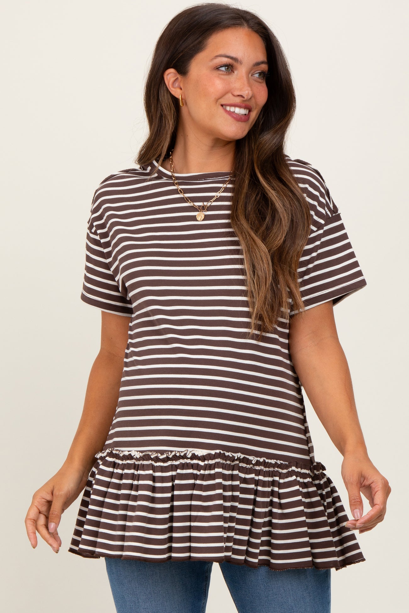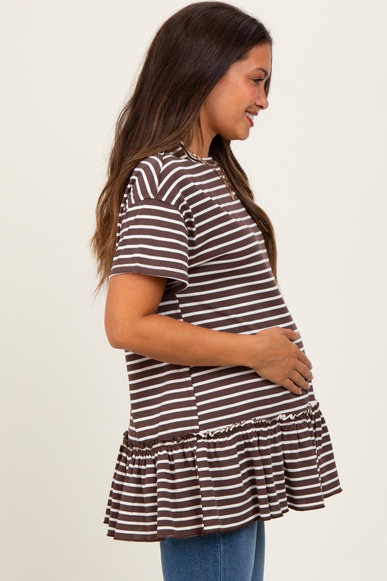 Mocha Striped Ruffle Hem Maternity Short Sleeve Top
