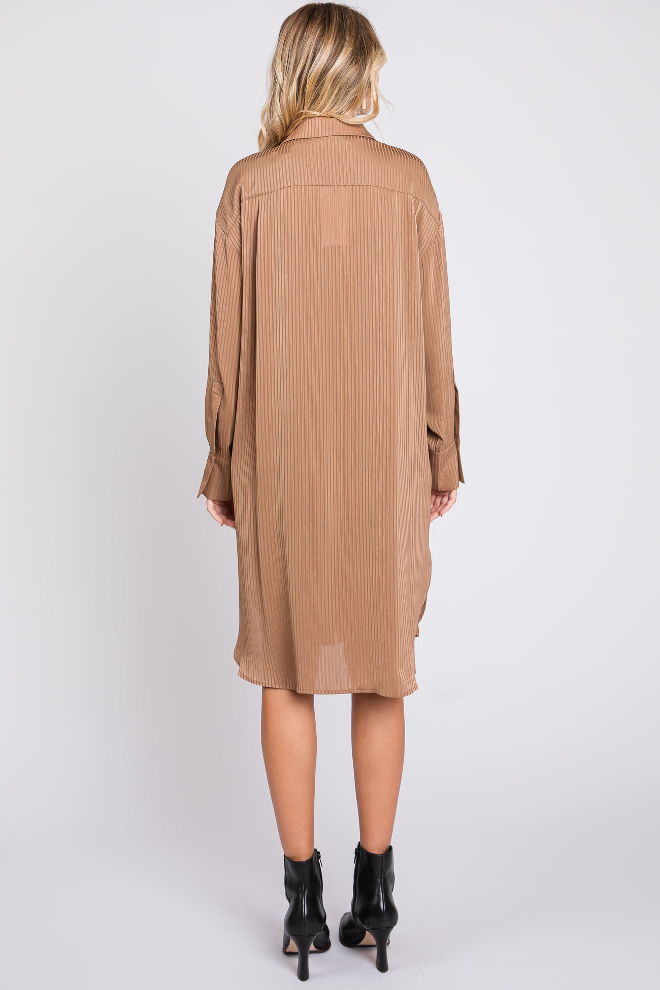 A striped shirt dress with a collared neckline, button down front and lining. Pocketed.