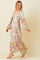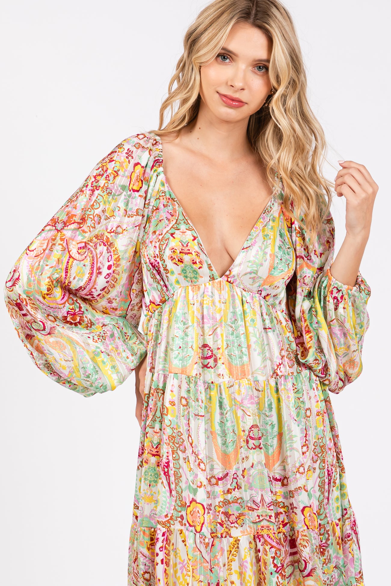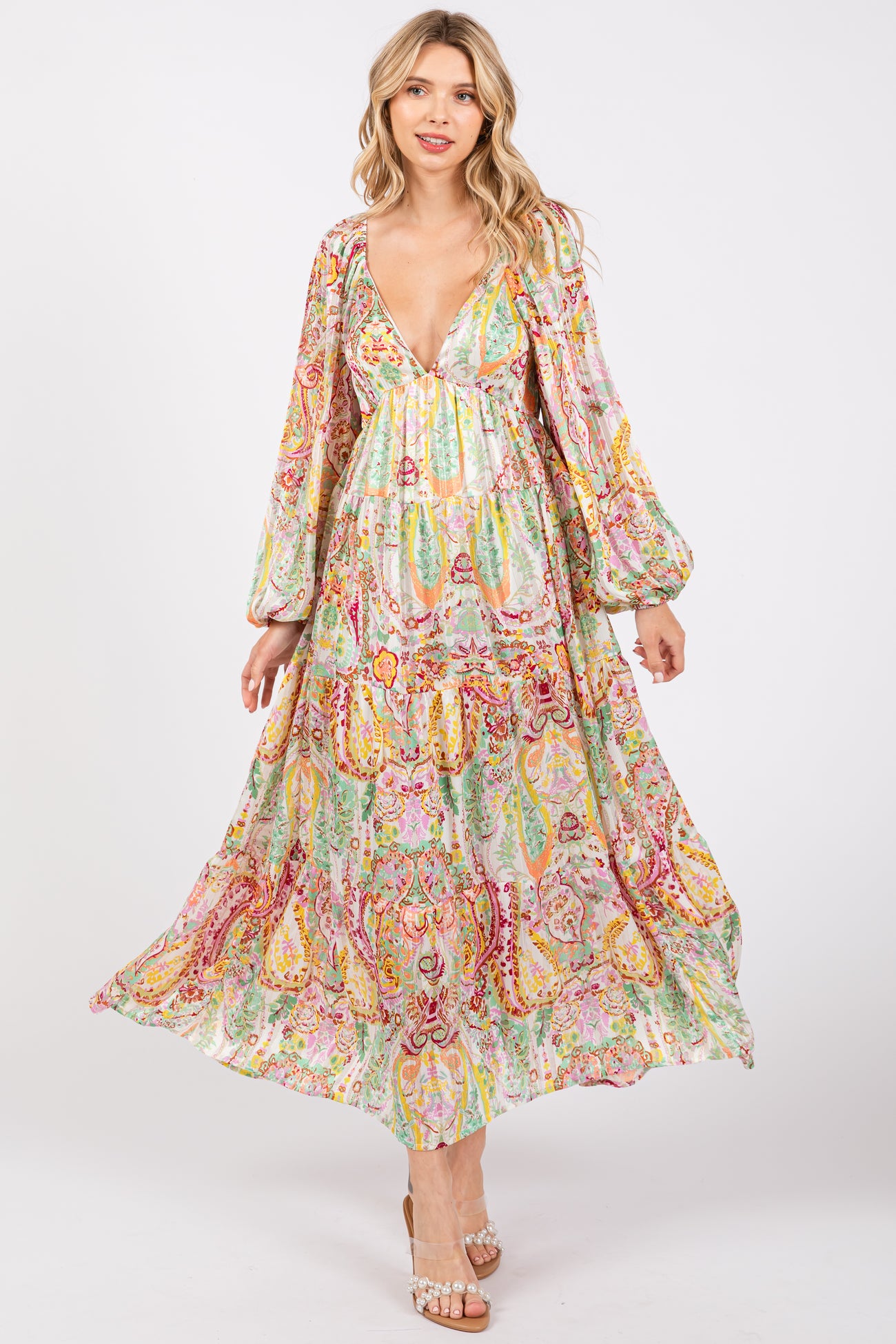Multi-Color Floral Metallic Striped Tiered Long Puff Sleeve Maxi Dress