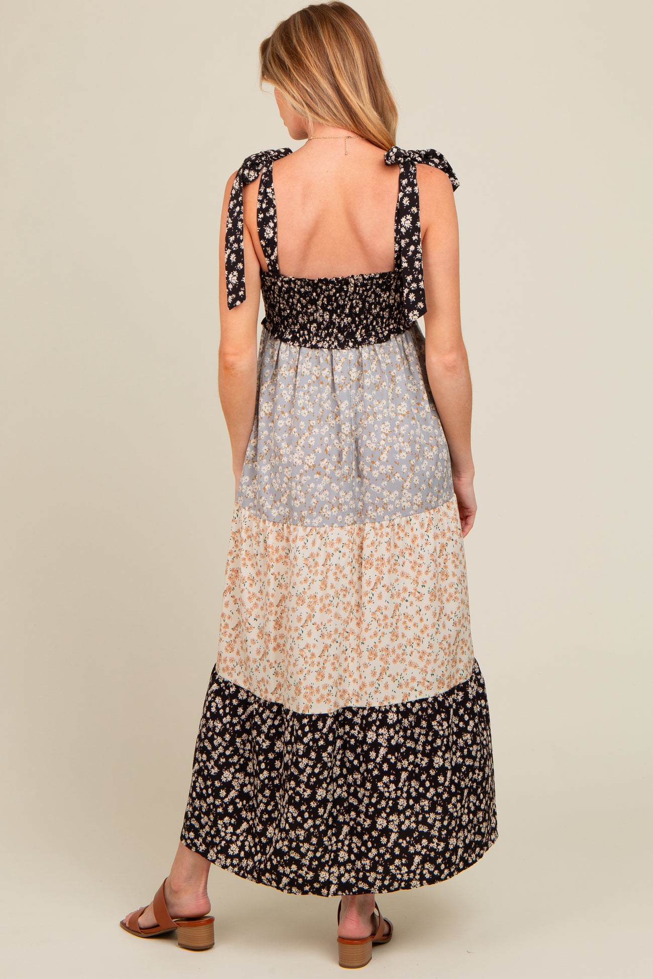 Multicolor Floral Colorblock Tier Shoulder Tie Maternity Maxi Dress