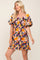 A floral dress with a squared neckline, short puff sleeves, an elastic waist, and a gathered bottom hem.