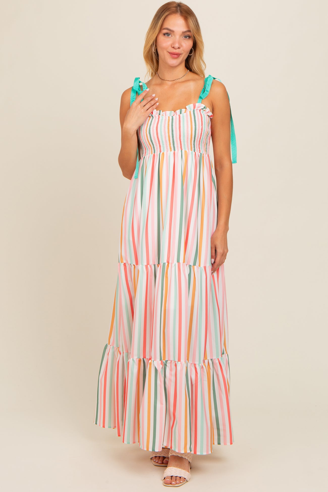 Multicolor Striped Shoulder Tie Smocked Maternity Maxi Dress