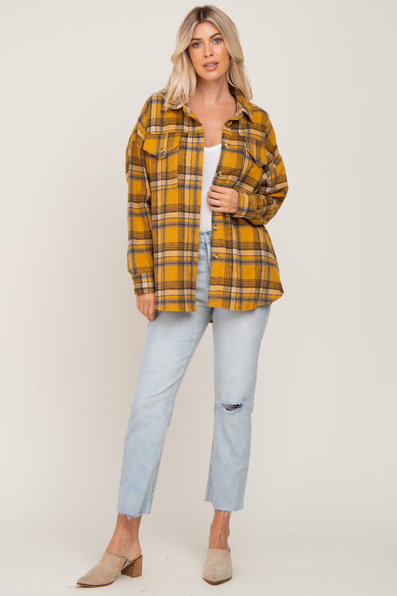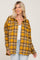 A plaid shirt jacket featuring long sleeves, front buttons, front pockets and a collared neckline.