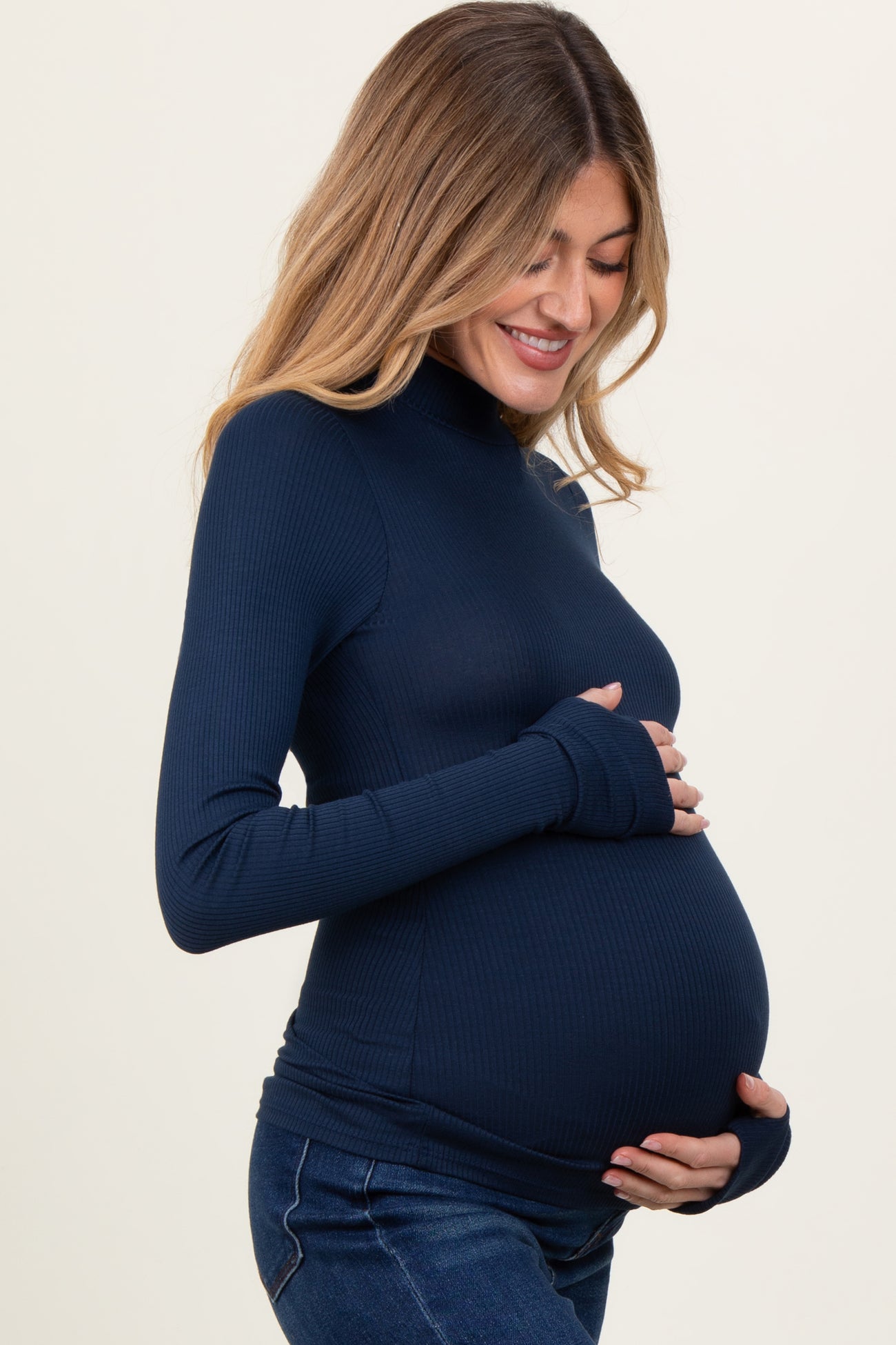 Navy Basic Thumbhole Mock Neck Maternity Top