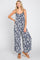 A floral print jumpsuit featuring front shirring with contrast trim, a rounded neckline and adjustable cami straps,