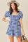 A printed romper with puff sleeves, square neckline with keyhole and tie detail and smocking in back. Romper is partially lined. Pocketed.