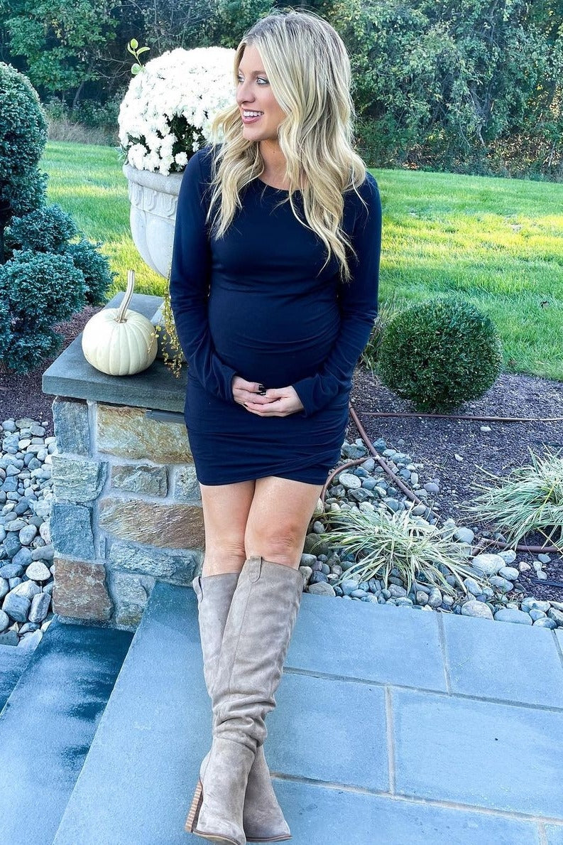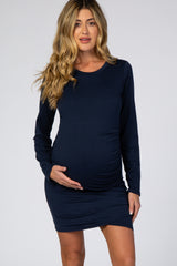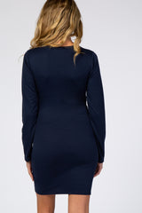 Navy Blue Long Sleeve Wrap Hem Fitted Maternity Dress