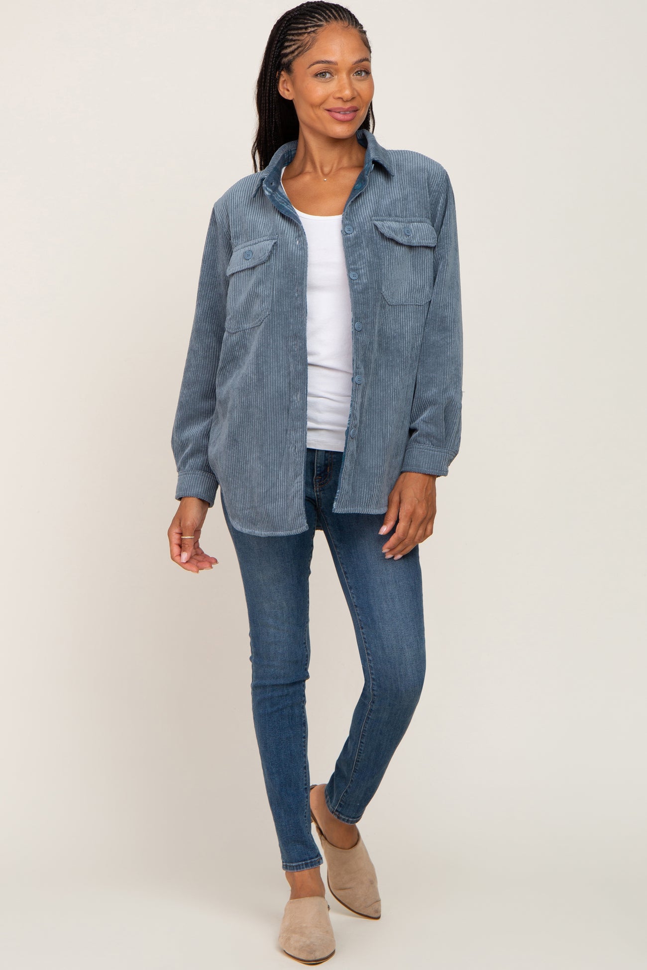 Details A reversible shirt jacket. Features solid ribbed velour side and fleece plaid side. Button closure. Two front pockets on solid side. Two side pockets on printed side. Content + Care