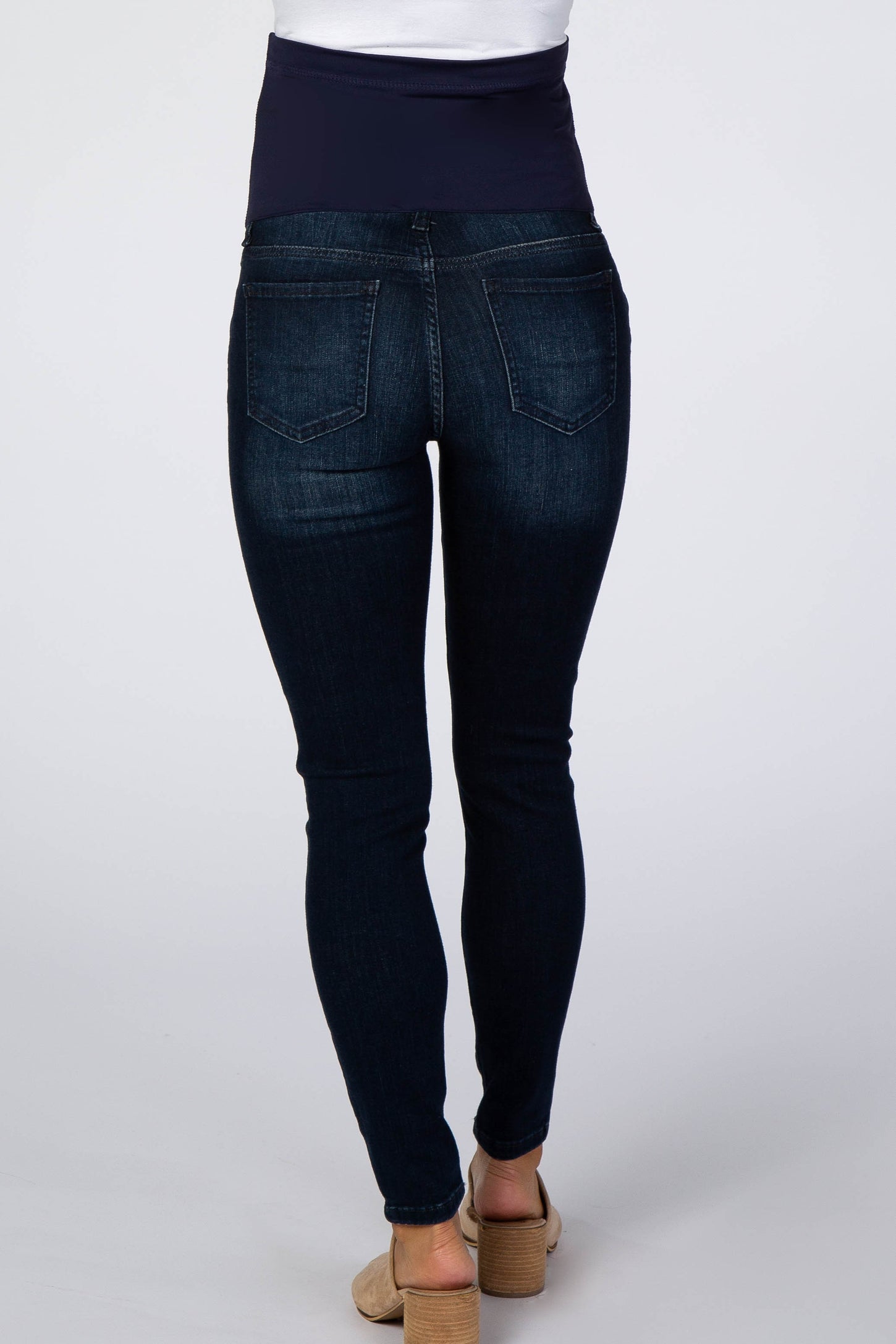 A pair of dark wash maternity skinny jeans featuring five pockets and an elastic belly band.