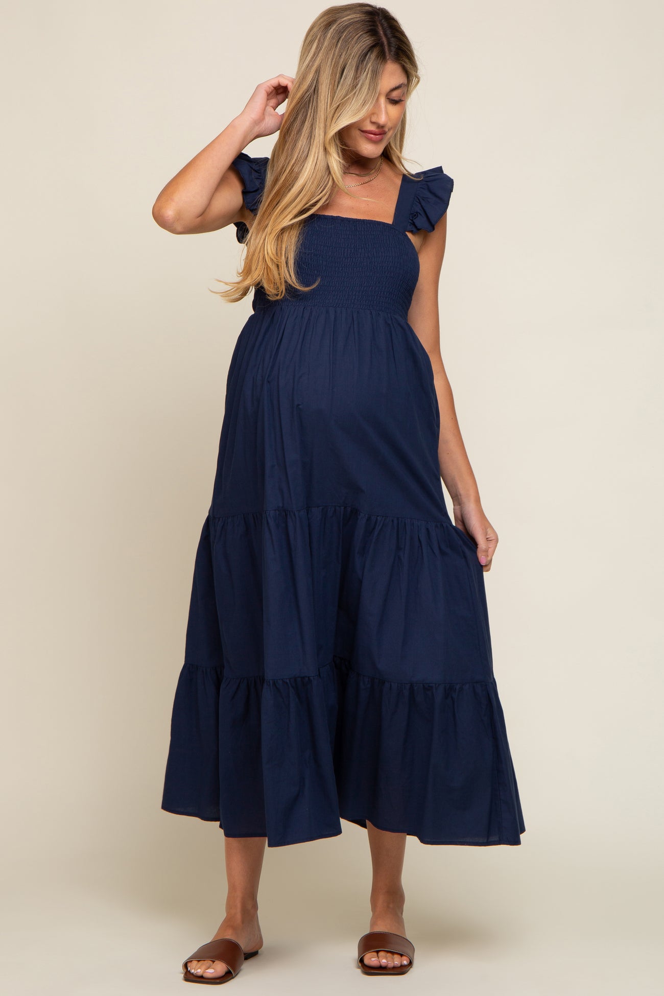 A sleeveless maternity maxi dress featuring ruffle shoulder straps, a smocked top, a tiered skirt, side pockets and a square neckline.