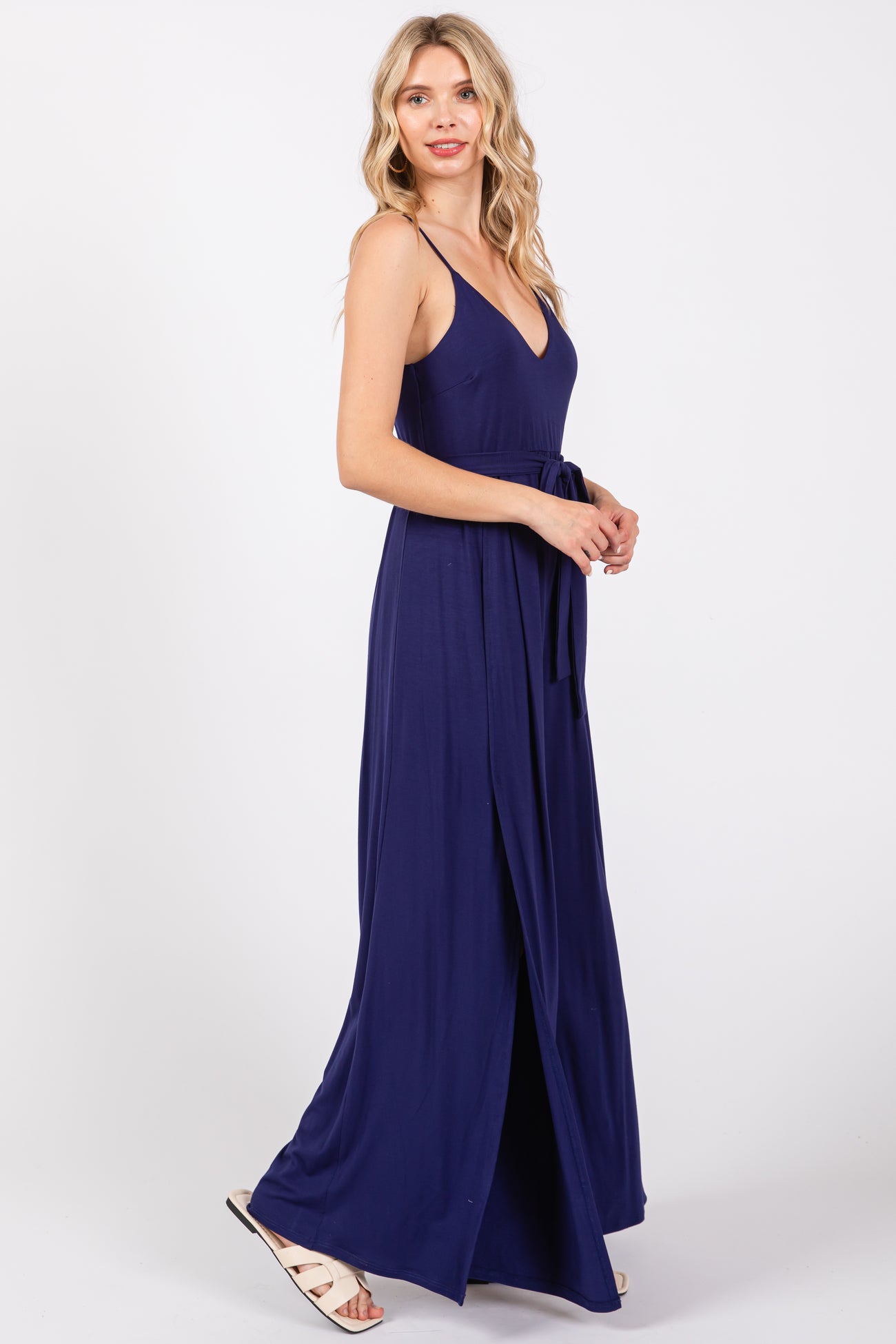 Navy Blue Sleeveless V-Neck Split Hem Jumpsuit