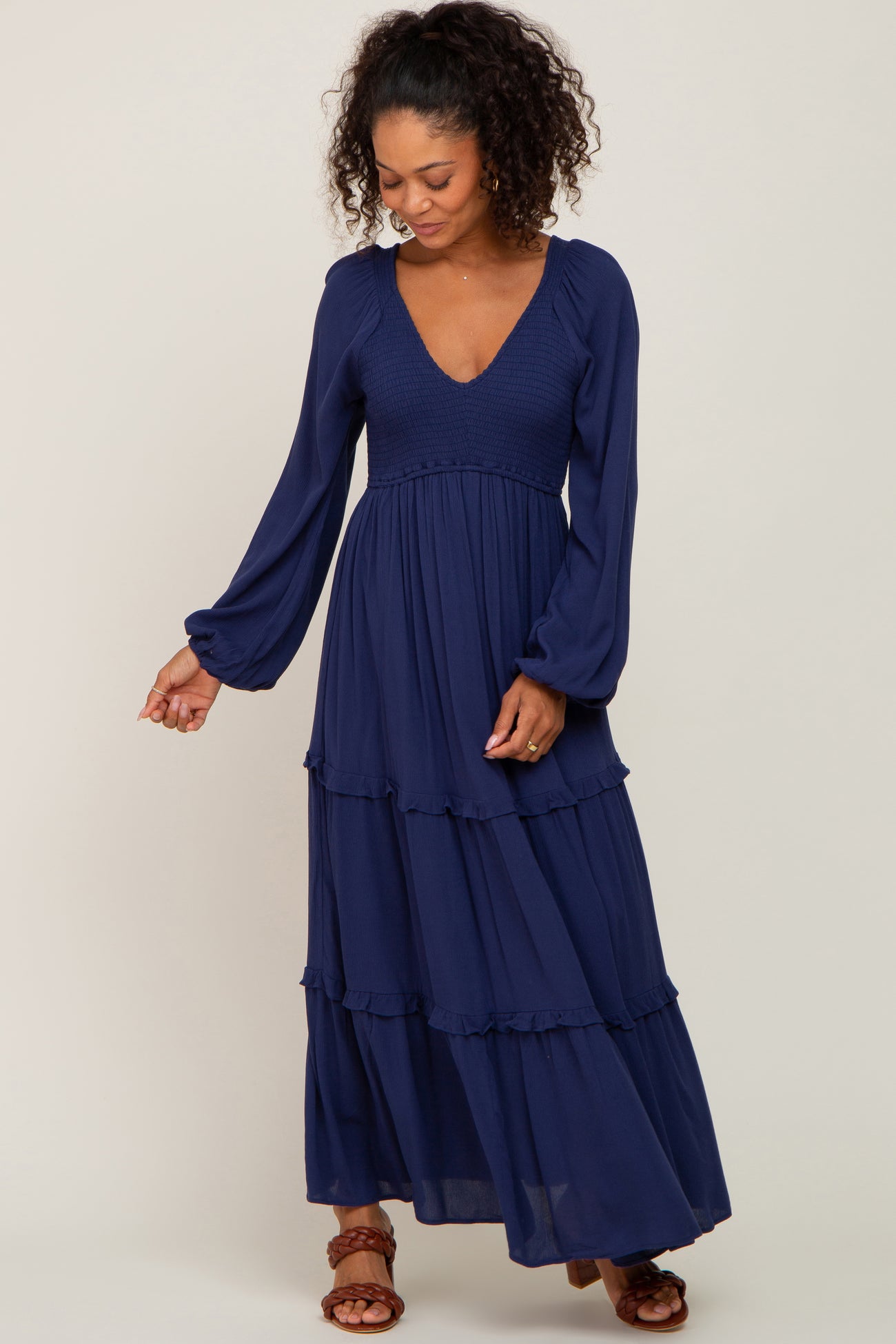 Navy Blue Smocked Tiered Maternity Midi Dress