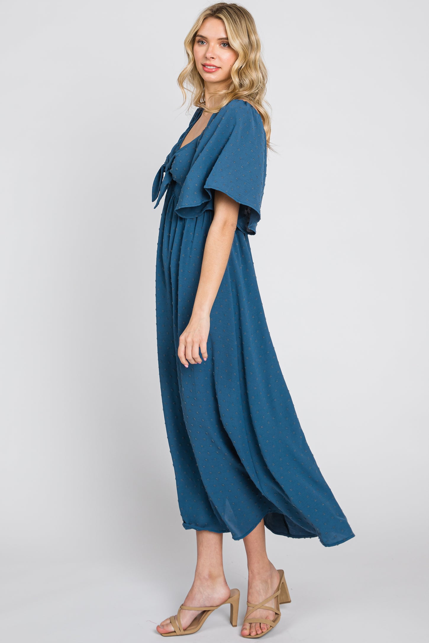 Navy Blue Textured Dot Front Tie Ruffle Sleeve Midi Dress