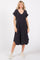 A knee-length dress with a v-neckline, short cuffed dolman sleeves, a curved hi-lo hem, and side slits.