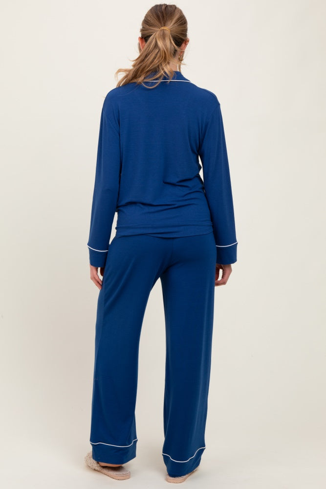 Navy Button Down Top Wide Leg Pant Maternity Pajama Set