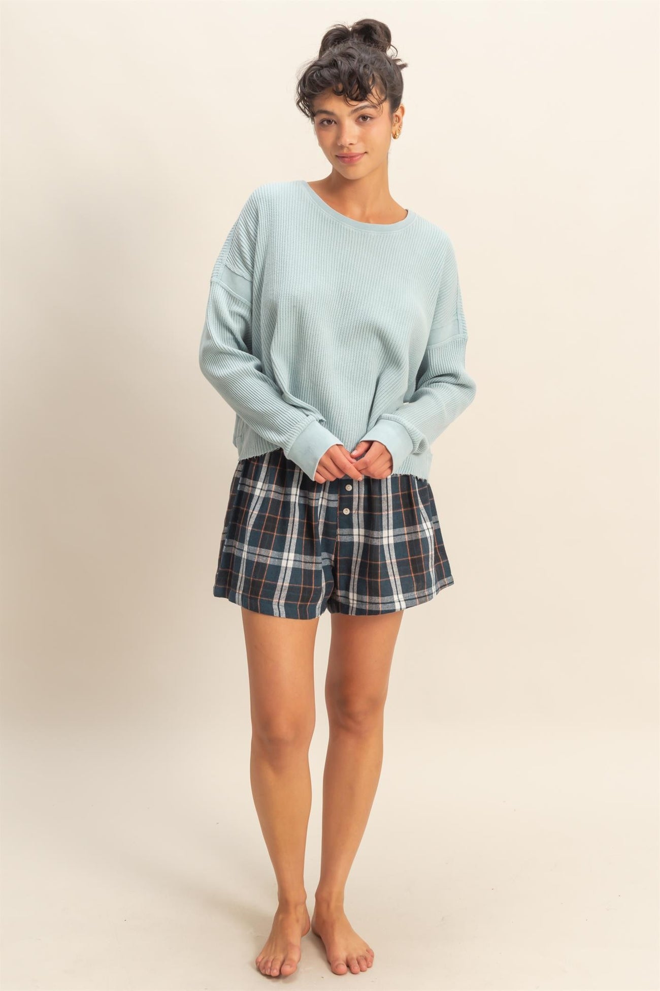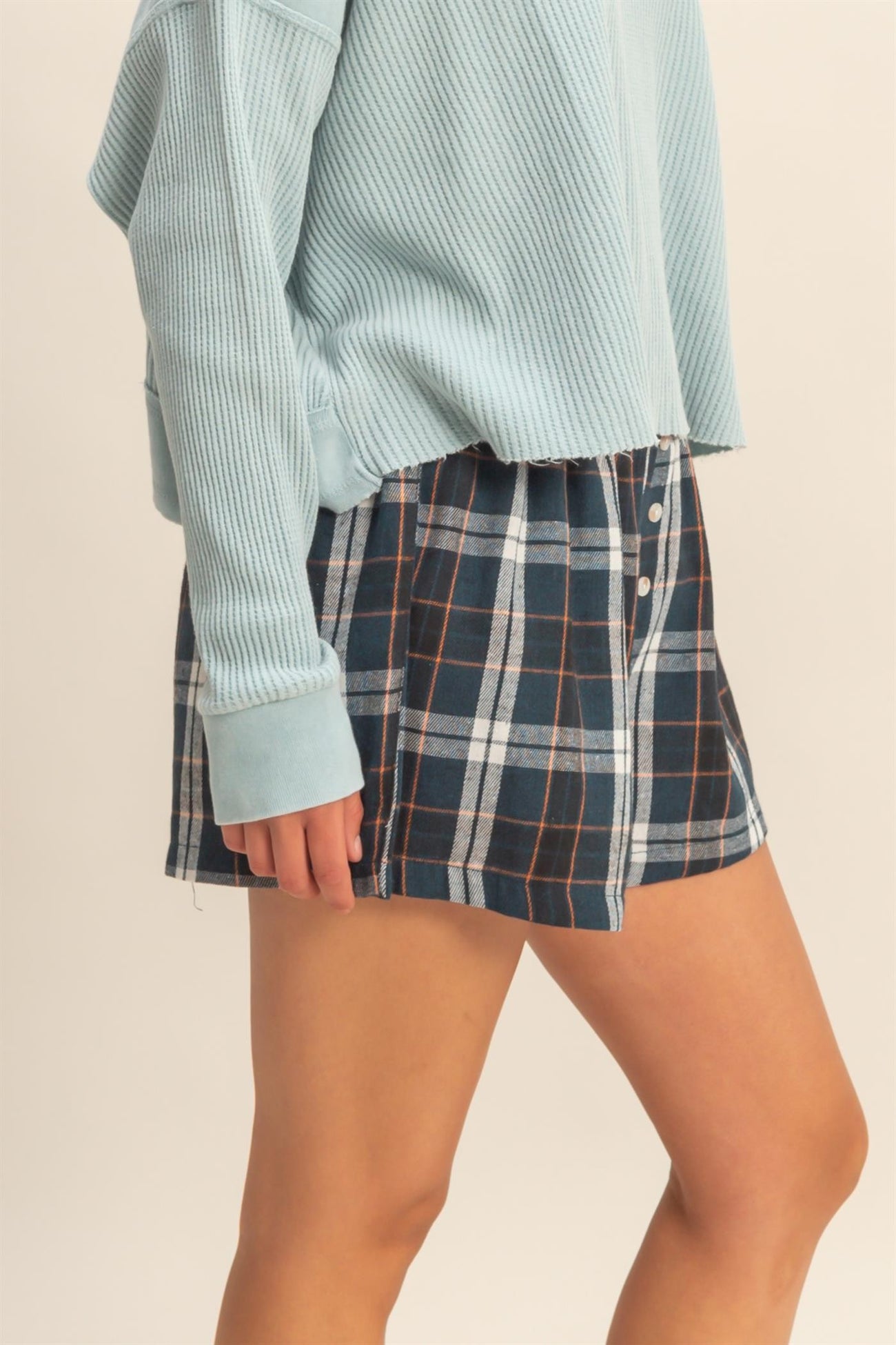 Stay cozy and stylish with our Navy Button-Front Plaid Boxer Shorts. Crafted from soft, breathable fabric, these shorts feature a timeless navy plaid pattern with subtle touches of white and rust. The relaxed fit and button-front design offer both comfort and easy wear, perfect for lounging weekends or casual sleepwear. Pair with your favorite oversized sweater or tee for an effortlessly chic, laid-back look. Designed for ultimate comfort without sacrificing style, these boxer shorts are a must-have essential for your loungewear collection. Available in multiple sizes to fit you perfectly!