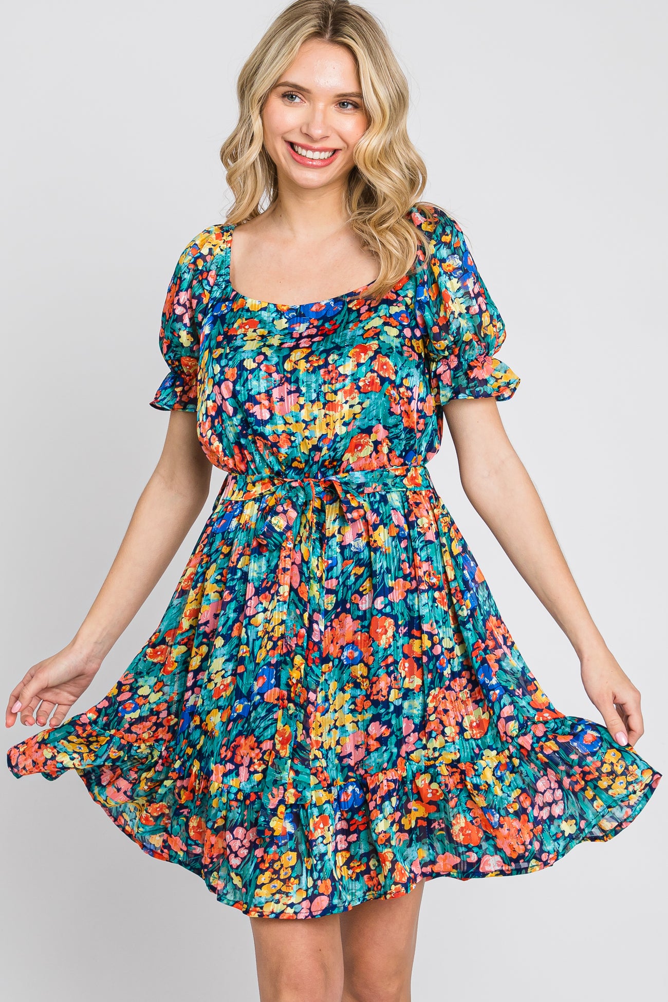 A floral print maternity chiffon dress with puff sleeves, sash tie waist and ruffle hem. Features metallic accent in fabric.