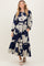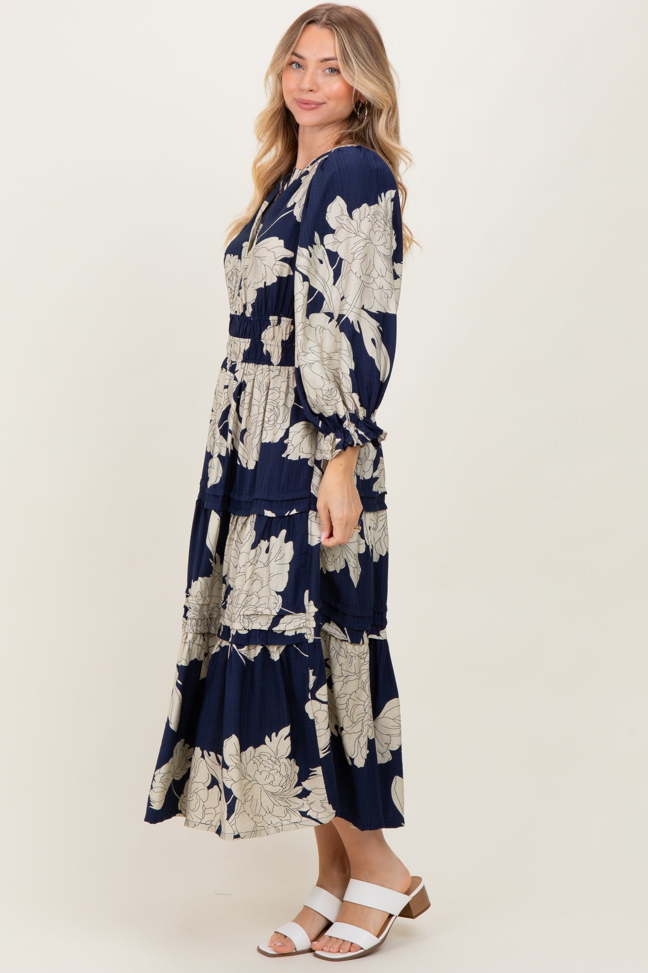 Navy Floral Long 3/4 Sleeve Tiered Midi Dress