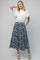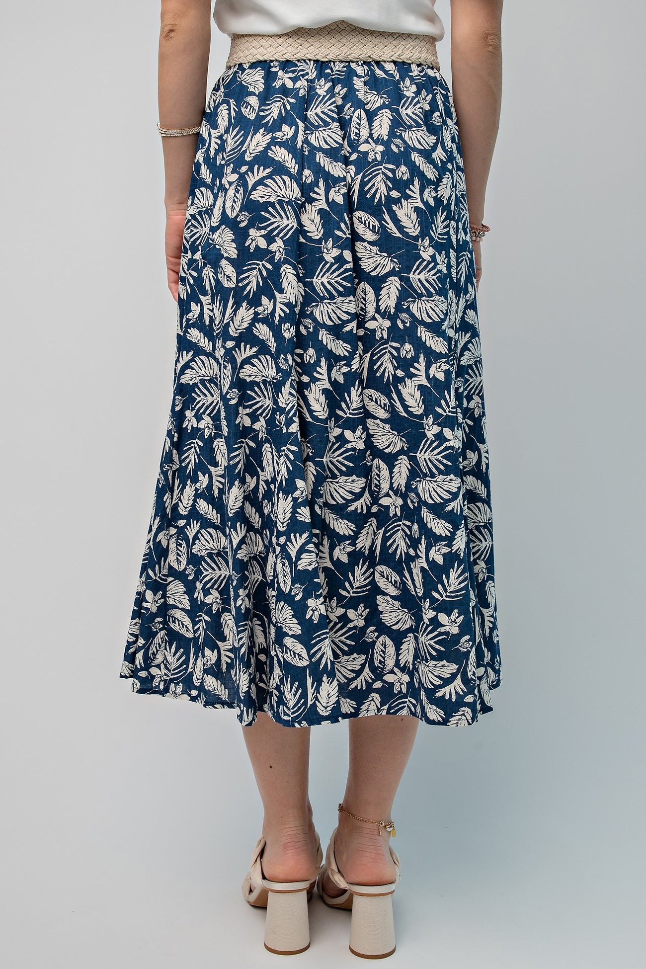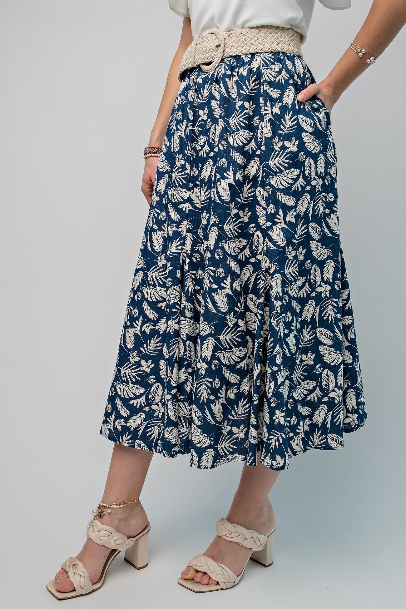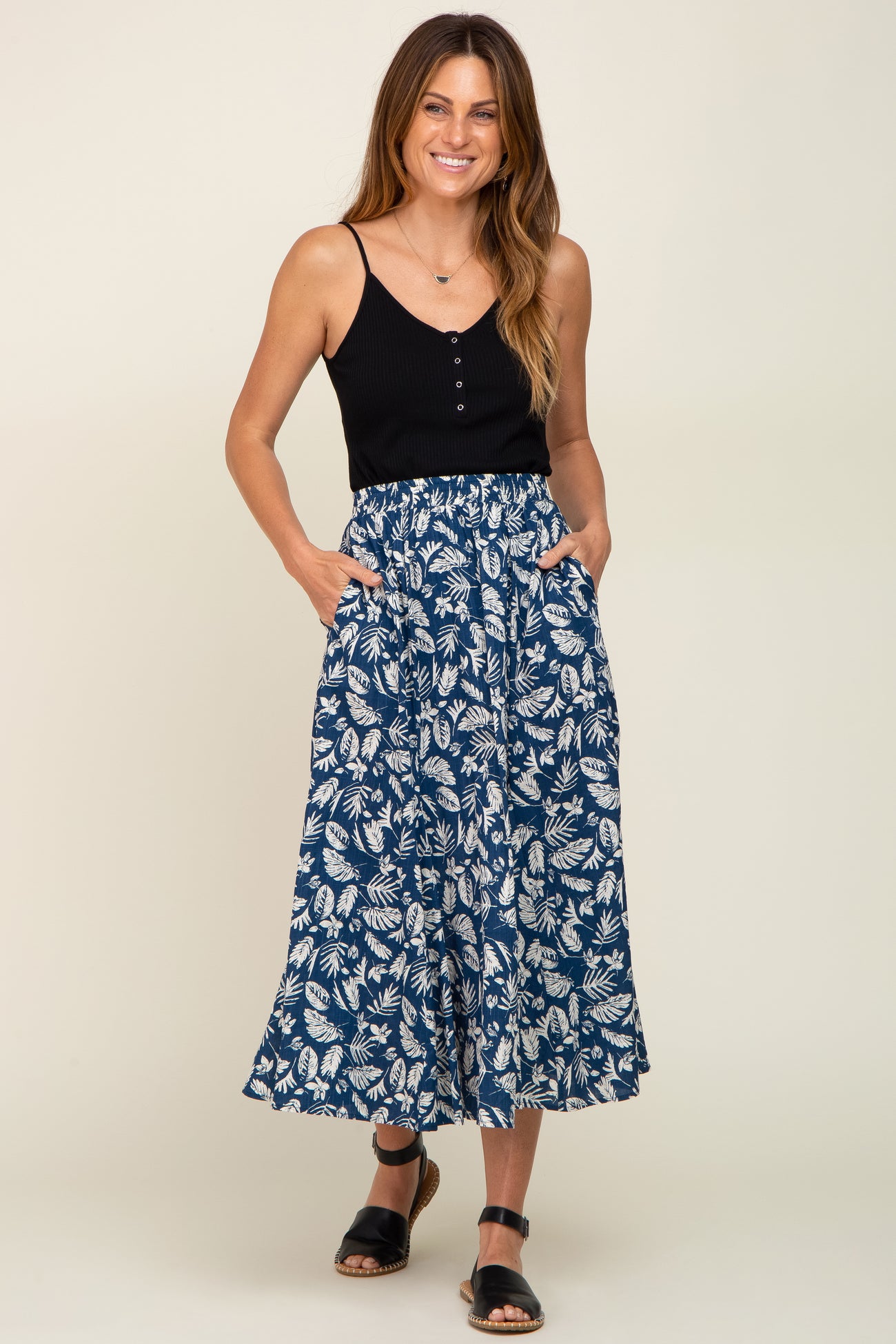 A floral print pleated midi skirt featuring side pockets and a smocked waistband.